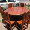 Este juego combina elegancia y resistencia, fabricado en algarrobo. La base torneada y las sillas reforzadas en madera de 2 pulgadas aseguran estabilidad y durabilidad, ideal para reuniones familiares y eventos.