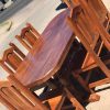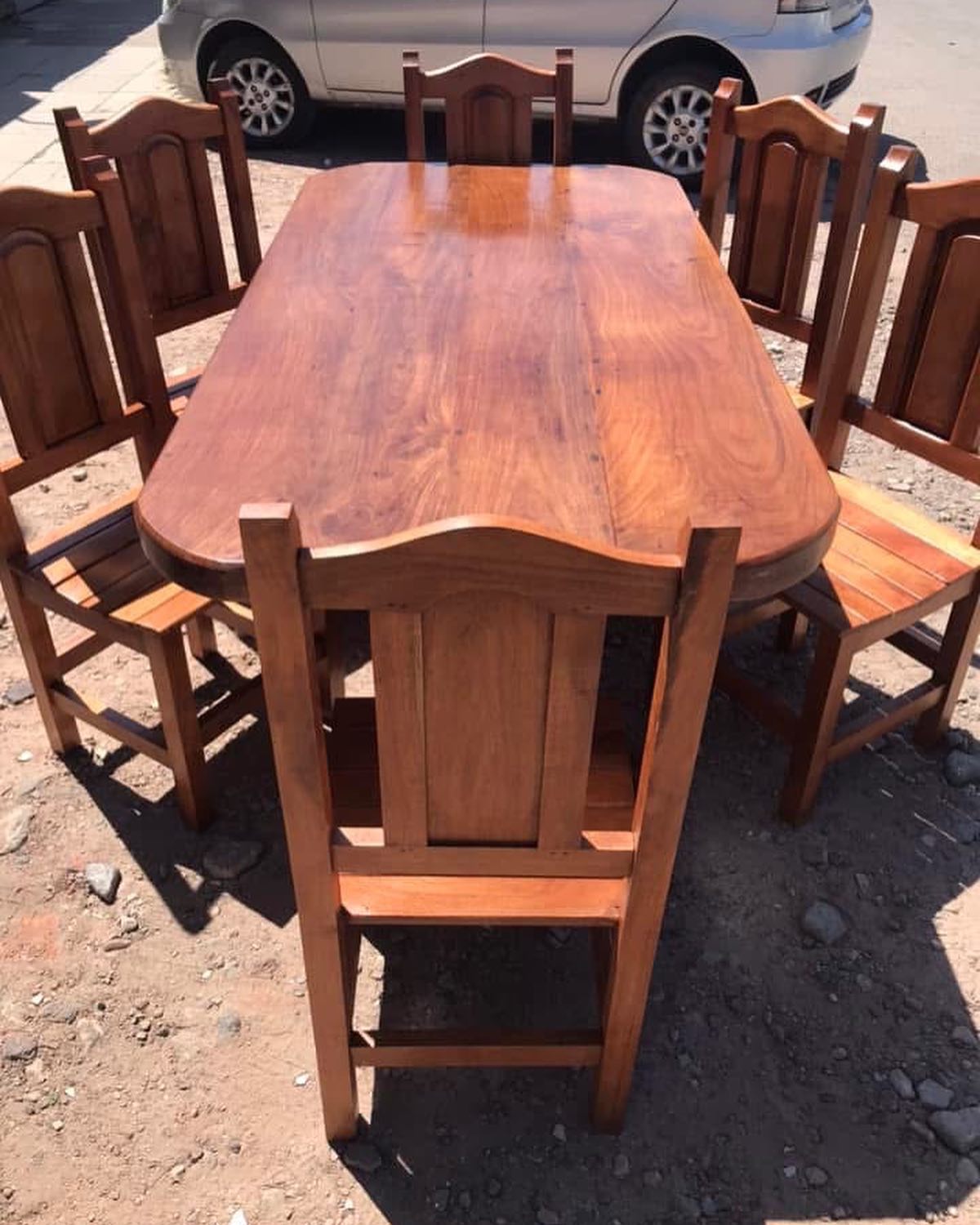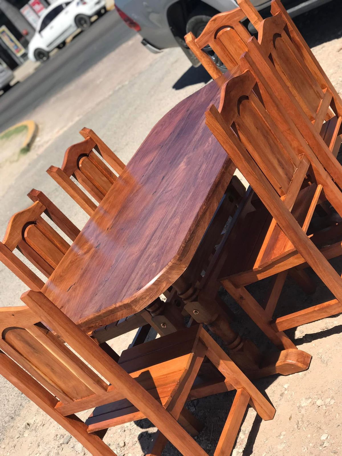 Este juego combina elegancia y resistencia, fabricado en algarrobo. La base torneada y las sillas reforzadas en madera de 2 pulgadas aseguran estabilidad y durabilidad, ideal para reuniones familiares y eventos.